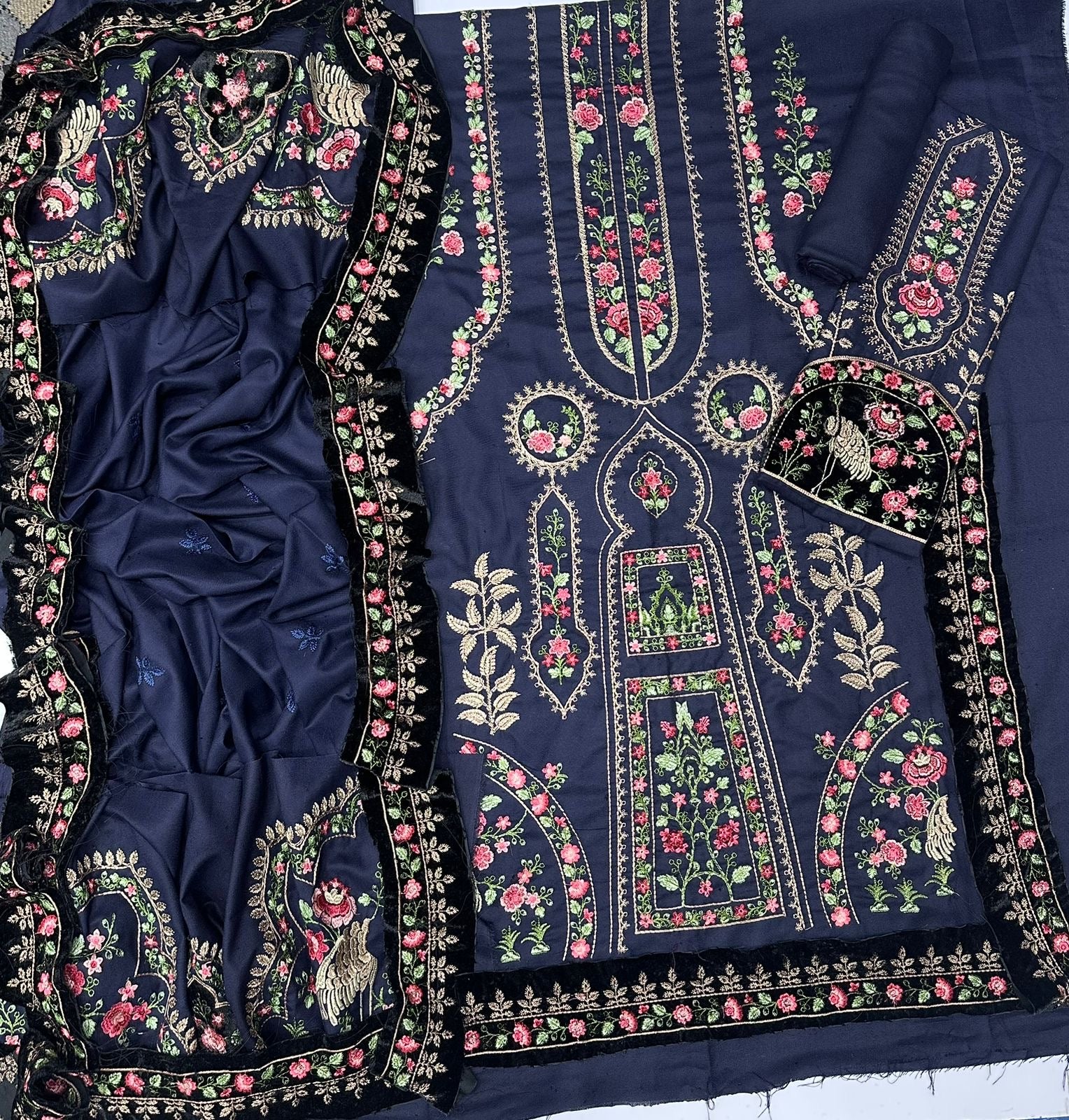 *Luxury Embroidered 3pc With Velvet Applique Work* *STUFF: Best Quality Air jet Dhanak Fabric*